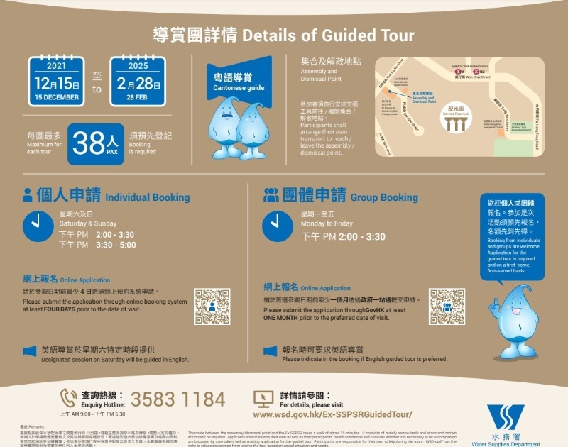 - -集散點與前深水埗配水庫之間需步行約 15 分鐘,路程主要為狹窄山路及梯級,需要一定的體力。