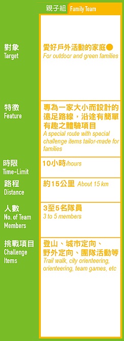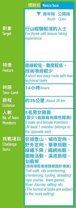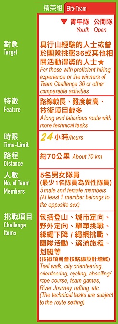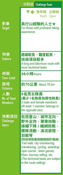 - 所有參加者必須以隊制形式參加活動,任何隊員缺席或退出,隊伍亦不能出發或繼續比賽。