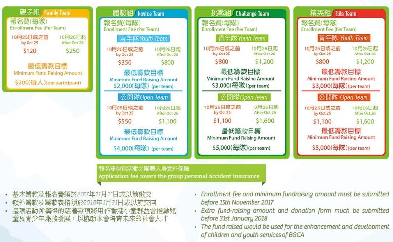 - 若活動受惡劣天氣或突發事件影響而被迫取消,參加者可選擇退還一半報名費或於明年活動報名時獲八成減免優惠。除以上情況外,所有報名及籌款金額一概不予退還。