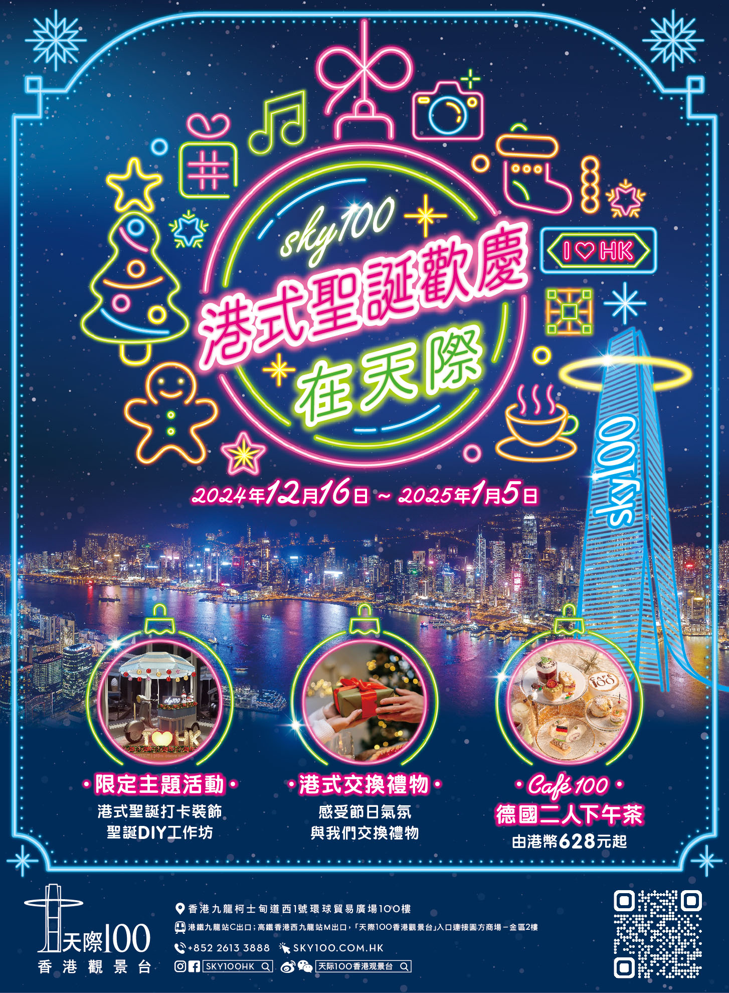 緊隨其後還有驚喜交換禮物環節、聖誕工作坊及新增導賞機器人服務,同時也不可錯過Café 100 by The Ritz-Carlton, Hong Kong推出全新限定的「德國下午茶」套餐與浪漫聖誕晚餐,天際100誠邀您攜同摯愛親友一同登上全港最高的天際100香港觀景台,享受高空美饌體驗。