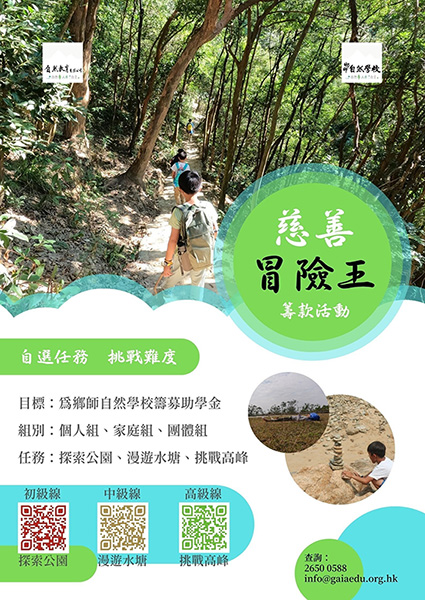 身體力行為鄉師自然學校籌募助學金,以資助有經濟需要的學生就讀自校。愛冒險又愛行善的你,立即參加或贊助朋友成為「慈善冒險王」吧!
