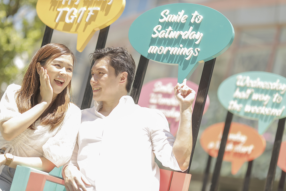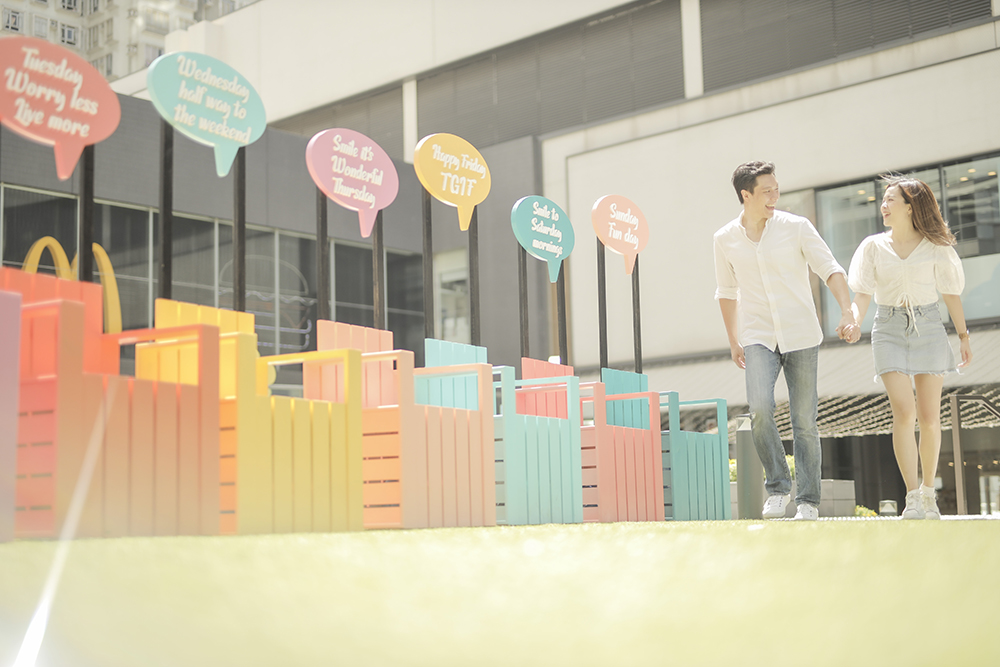 除了兩大自然主題裝置,商場亦在露天廣場設置了「七色心情花園椅」,以七組巧思妙語,細說由週一至週日的心情變化,如 “Monday a fresh start”、“Wednesday half way to the weekend”、“Sunday fun day” 等,為在週間不同日子到訪的訪客打氣,以樂觀自在的心情享受每一天。小巧精緻的木椅塗上柔和淡雅的色彩,加上特色字句,絕對是文青必到的打卡點。
