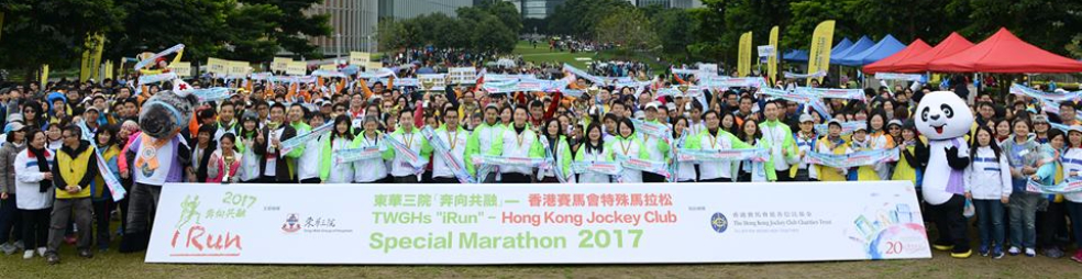 往年東華三院「奔向共融」-香港賽馬會特殊馬拉松2017繼續得到香港賽馬會慈善信託基金鼎力贊助,參加人數今年再創新高,逾3800名智障運動員及伴跑員參加。活動更增加共融大巡遊作為起步禮表演,由150名精神健康大使及智障人士,結伴同跑,一起經驗靜觀減壓的「慢活跑」,既讓較少運動的朋友體驗靜觀慢慢跑的樂趣,亦向社會大眾推廣靜觀慢跑有益精神健康的訊息,締造一個愛心共融的社會。