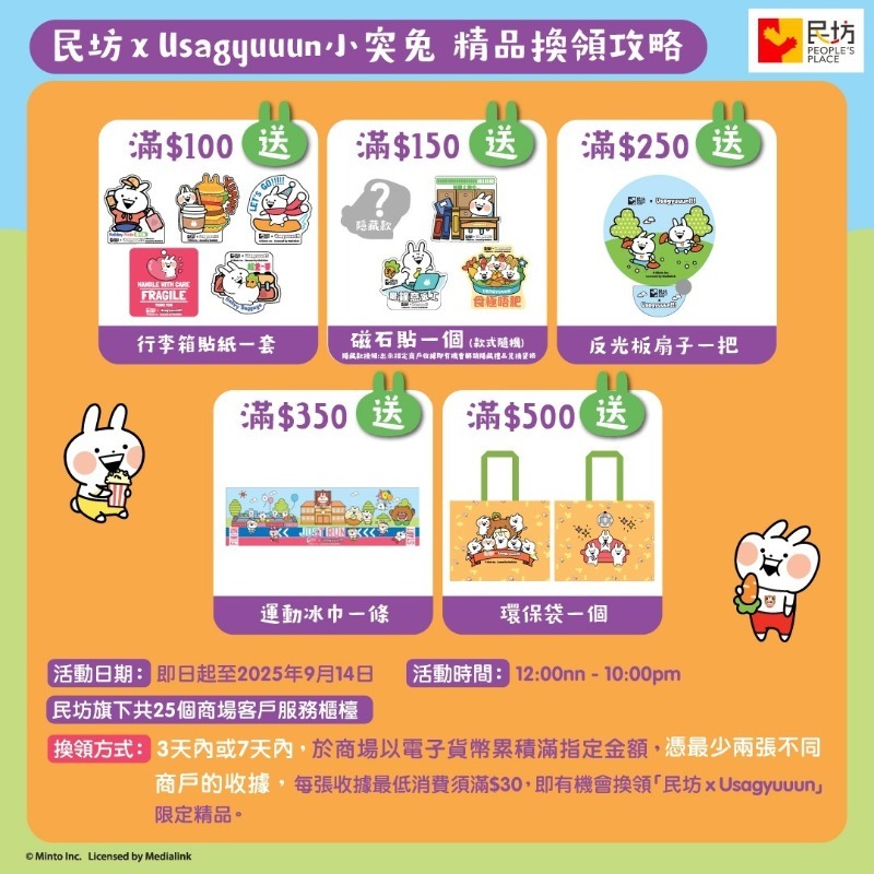 ⭐️換領方式:3天內或7天內(兆禧苑商場),於商場以電子貨幣累積滿指定金額,憑最少兩張不同商戶的收據,每張收據最低消費須滿$30,即有機會換領 「民坊 x Usagyuuun」限定精品。