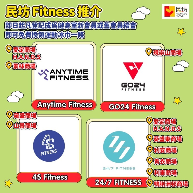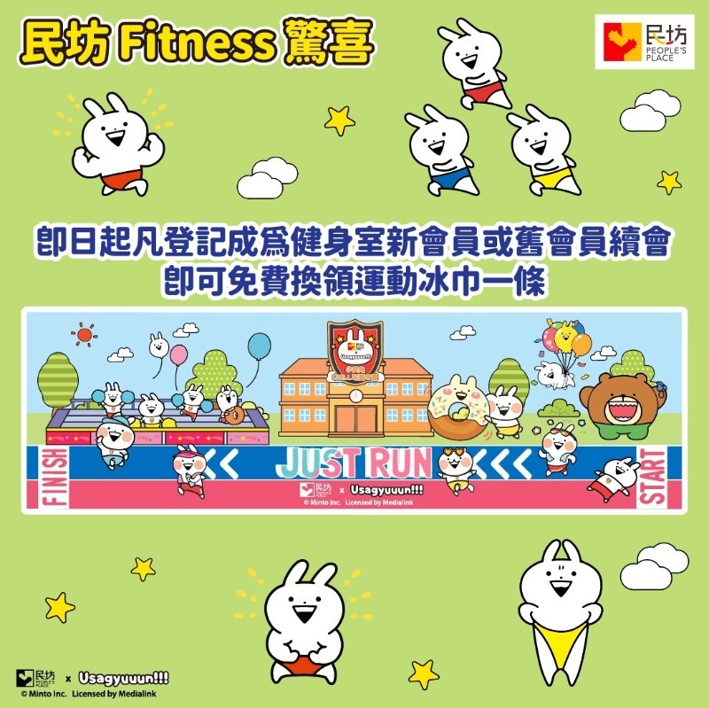 只要到民坊旗下商場健身室中心登記成為新會員或舊會員續會*,即可免費換領冰巾一條!