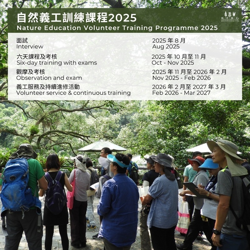 自然教育義工訓練課程旨在為熱衷於嘉道理農場暨植物園自然教育活動的人士提供培訓。透過一系列體驗式活動及生態導賞訓練,參加者能從中學習環境保育知識、教學和導賞技巧。完成訓練及通過評核後,學員將正式成為義工,協助帶領及導賞本園各類自然教育活動;並有機會參加多元化的轉化工作坊、靜心體驗及自然藝術活動等,讓身心回復和諧寧靜,體驗整全的健康生活。