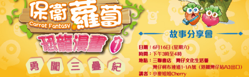 由得獎漫畫團隊笑江南打造的《保衛蘿蔔.恐龍漫畫》系列,找來可愛的蘿蔔與大受小朋友歡迎的恐龍擔任主角,惹笑的冒險故事穿插深入淺出的科普知識,帶領小讀者認識億萬年前的地球生態!想知道蘿蔔如何穿越到史前世界、逃避恐龍的攻擊 ? 想知道更多有關恐龍的有趣知識?快來報名參加活動,聽小麥姐姐說故事及一起玩遊戲吧!
