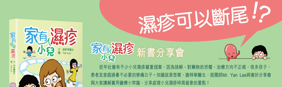 迎年社會有不少小兒濕疹嚴重個案,因為誤解、對藥物的恐懼、治療方向不正確,很多孩子、患者及家庭過着不必要的慘痛日子。知識就是答案,謝梓華醫生,插圖師Mr. Yan Lee將會於分享會與大家講解實用醫療小常識,分享處理小兒濕疹時需留意的重點!