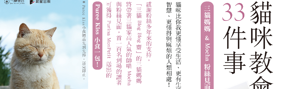 感謝粉絲多年來的支持,「三貓Blog Blog齋」的三貓媽媽將帶著三貓家高人氣的師貓Mocha與粉絲見面,首100名到場的讀者可獲得Purina MonPetit送出的Puree Kiss小食一包!