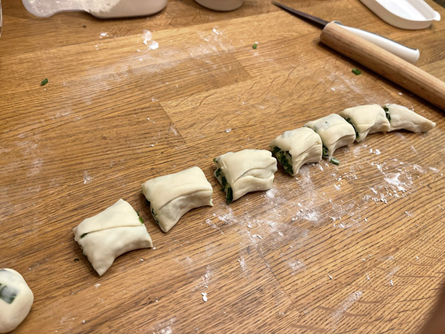 6. 將長捲麵團切成約5cm長度(此相等於一塊葱油餅份量),輕力搓圓再壓成圓形,放熱油鑊煎即成。