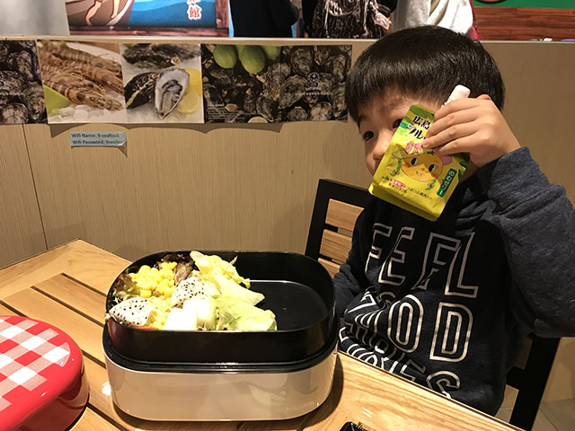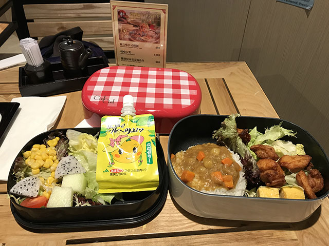 楊小寶選的是日式咖喱飯, 甜甜的不辣, 還有果汁, 蔬菜和水果!
