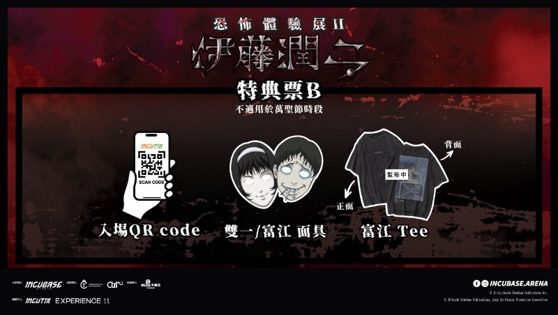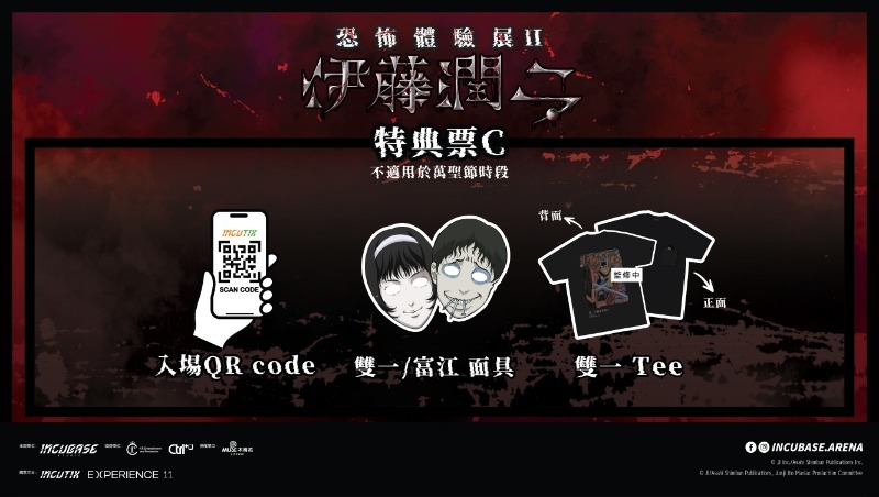 展期特典票B-$399/套(適用於9月19日至10月10日及11月1日至9日的場次,展期特典票B包含1張入場票及1件展覽限定富江 T-shirt)