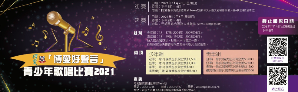 2. 如未能 將 網上報名 於 截止報名日期 前 將已 填妥的報名表連同不多於 2 分鐘的唱歌片段,以 CD/DVD 燒錄交至「博愛醫院慧妍雅集新 Teen 地」。
