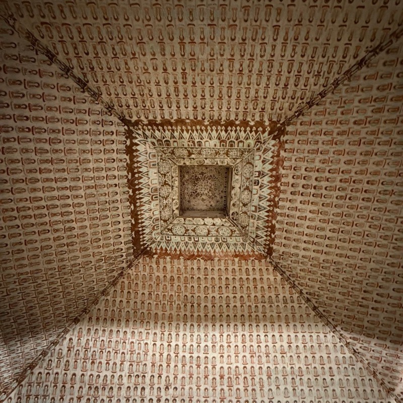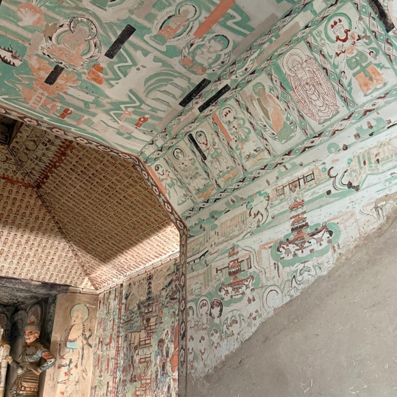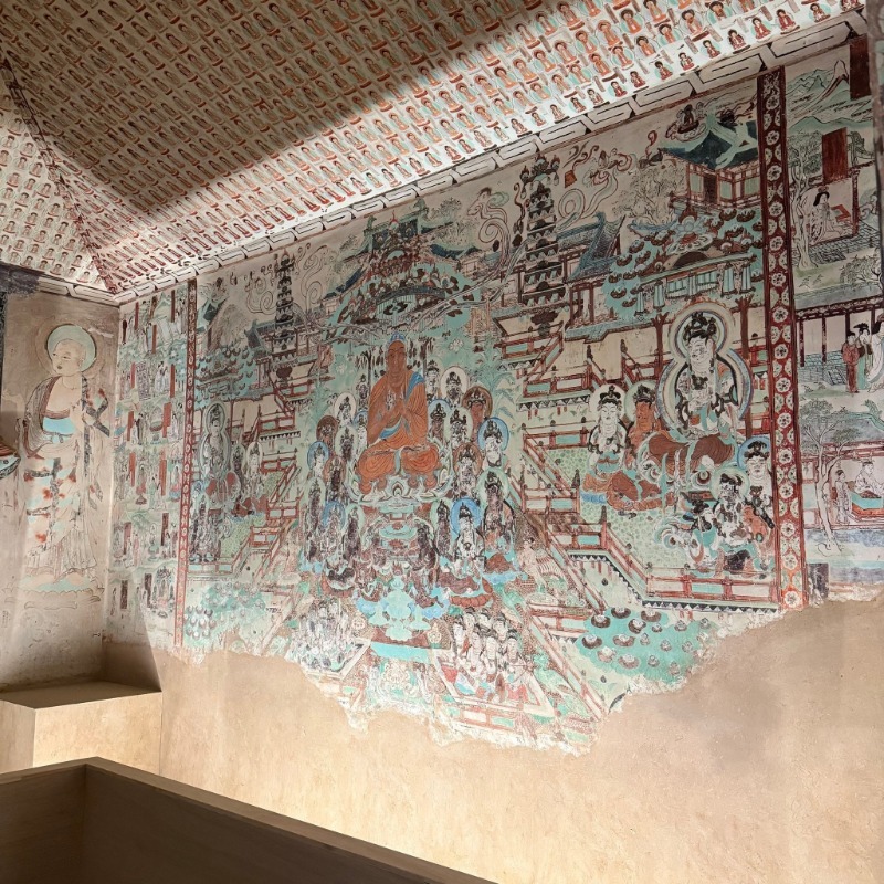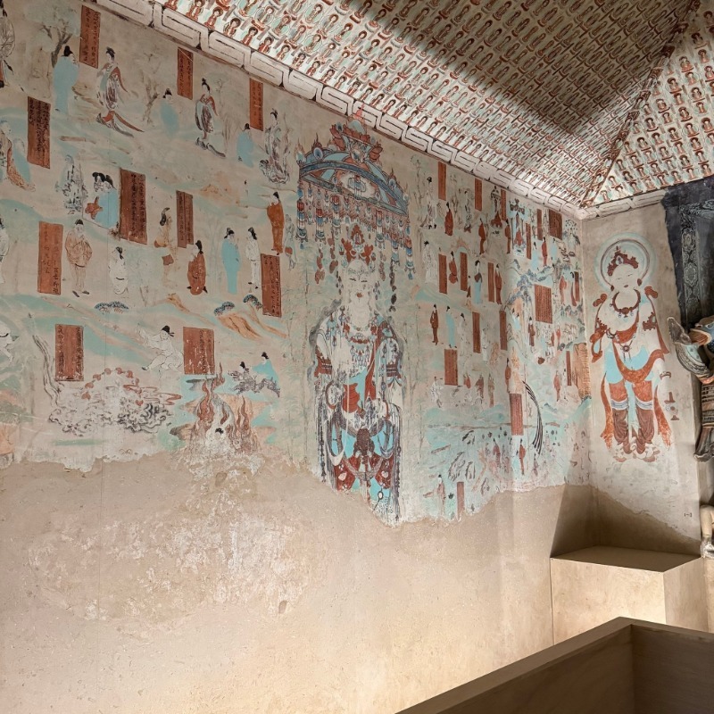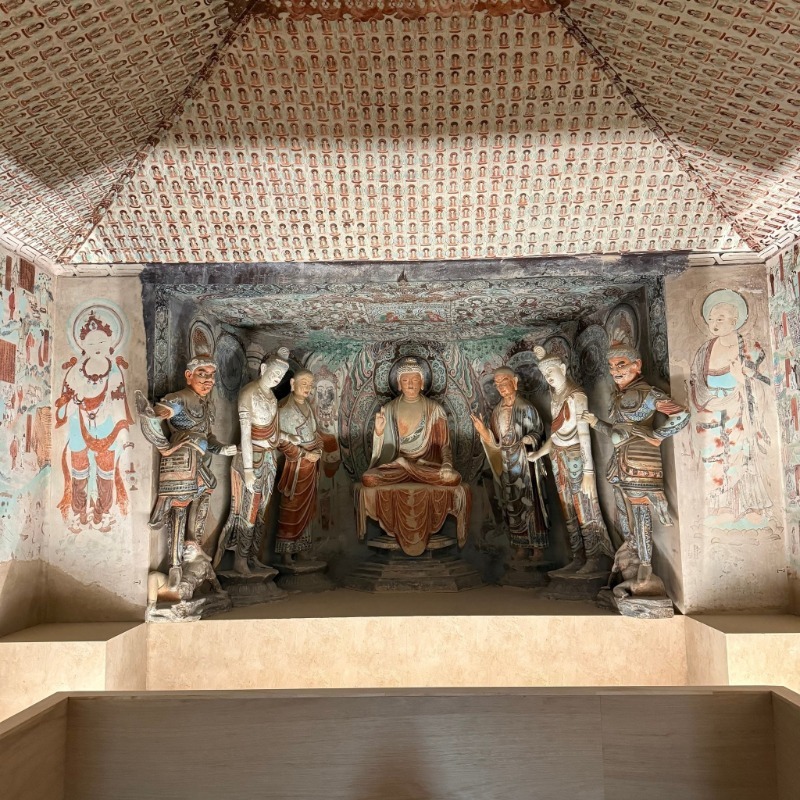 當您走進這座1:1復原洞窟時,首先映入眼簾的是七尊像中央的佛陀——其右手結說法印,左手輕置左膝,呈「降魔坐」姿態,端坐於華麗的蓮花須彌座上。🌸 佛陀袈裟的繁複紋理與鮮豔色彩更顯莊嚴,而窟內壁畫則匯集了《法華經》變相圖、千佛藻,以及描繪西方淨土的《觀無量壽經變》變相圖,充分展現盛唐藝術家對情感、神韻與形體之美的精湛刻畫。
