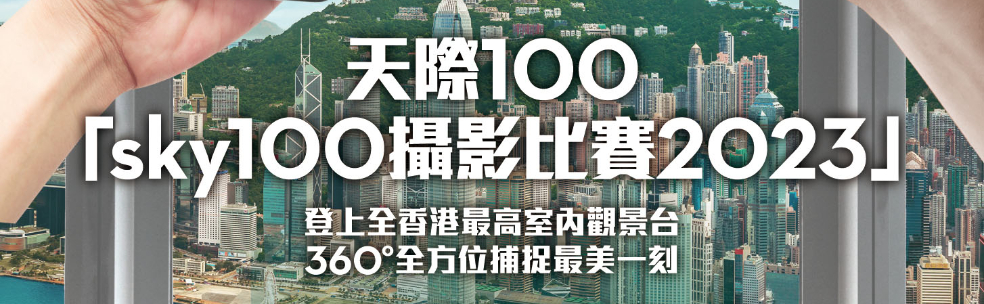 天際100香港觀景台舉辦「sky100攝影比賽2023」於2023年7月12日至9月6日正式展開,誠邀公眾、攝影愛好者發揮潛能,在海拔393米高空攝下香港的美好景致,以鏡頭定格千變萬化的雲彩及不同景色。天際100的景觀十分多元化,從東面可無阻擋地俯瞰中環及維港兩岸的著名地標和摩天大廈,五光十色的夜景完美地展現屬於「東方之珠」的魄力;南面則可欣賞繁盛的金融樞紐及西九龍文化區;西面可遠眺車水馬龍的青馬大橋,觀賞水天一色的日落景觀;北面有高聳入雲的獅子山及九龍半島,感受港人的獅子山下精神,種種景色建構於香港獨有的壯麗風景。