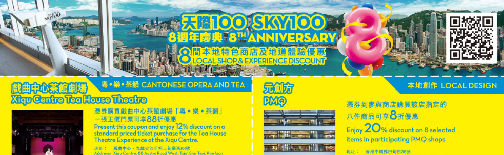 天際 100的推廣活動不斷推陳出新,是次更把旅程由高空延伸至地面!趁著8週年台慶的大日子,首次聯同位於佐敦、油麻地及中環8家香港老字號商店及文藝熱點推出獨家優惠,並設計了「上天落地」的簡易旅遊路線,讓訪客在393米高空俯瞰香港美景後,可以走進社區,近觀香港獨有的文化藝術,如到毗鄰的戲曲中心以88折優惠價錢購買茶館劇場門票,一邊欣賞粵劇曲藝及折子劇目,一邊品嘗點心茗茶,聆聽導賞員深入淺出的解說,親身體驗戲曲藝術;再走訪多家鄰近的老字號商店以8折的優惠價錢買到馳名中外的地道手信,如頂級老腐乳、手製繡花鞋、手雕蔴雀、特色的紅色小巴牌、甚至烤雞蛋仔的模具及由老師傅即席開鋒的各式刀具等;亦可到雲集過百位設計師與創意產業的PMQ元創方,以8折優惠在參與商戶選購設計獨特的衣飾單品,把香港的旅遊回憶及原創設計一併帶回家。無論是港人趁著復活節或勞動節假期作家庭遊,或是盡地主之誼帶到訪的海外親友暢遊香港,由天際100出發,即可輕鬆展開一整天行程豐富又別具特色的香港探索之旅。