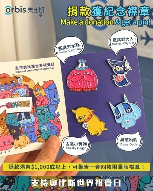 即日起至2025年10月31日,捐款支持「奧比斯世界視覺日」即可隨機獲贈一枚奧比斯可愛動物襟章,包括呆萌狗狗、圓滾滾水豚或傲嬌貓大人,為自己或身邊的人增添趣味色彩。