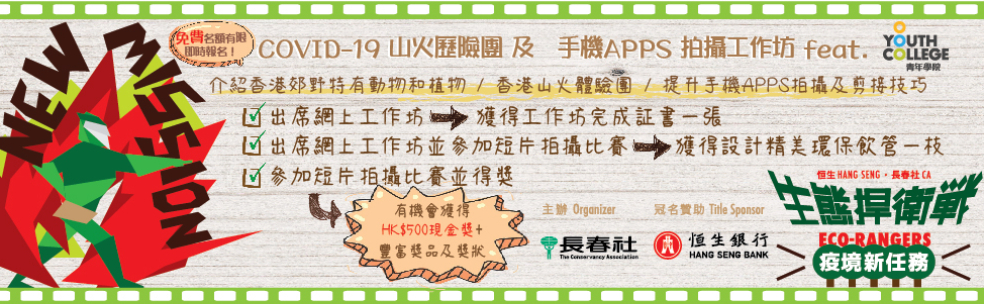對本地生態、拍攝、剪片有興趣的你,立即報名【長春社生態捍衛戰 山火歷險團 & 手機APPS 拍攝工作坊】啦!工作坊費用全免,參加短片拍攝比賽還可以得到証書及設計精美環保飲管一枝!名額有限,報名從速!