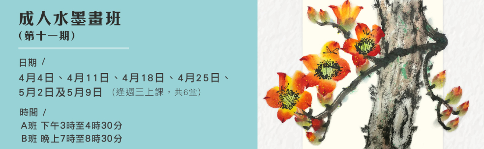 活動內容:第1堂 - 寫意畫之水墨竹與蝸牛,第2-3堂 - 半工意畫之彩墨錦鯉與木芙蓉,第3-4堂 - 半工意畫之彩墨木棉樹,第5-6堂 - 山水畫之春景,夏景