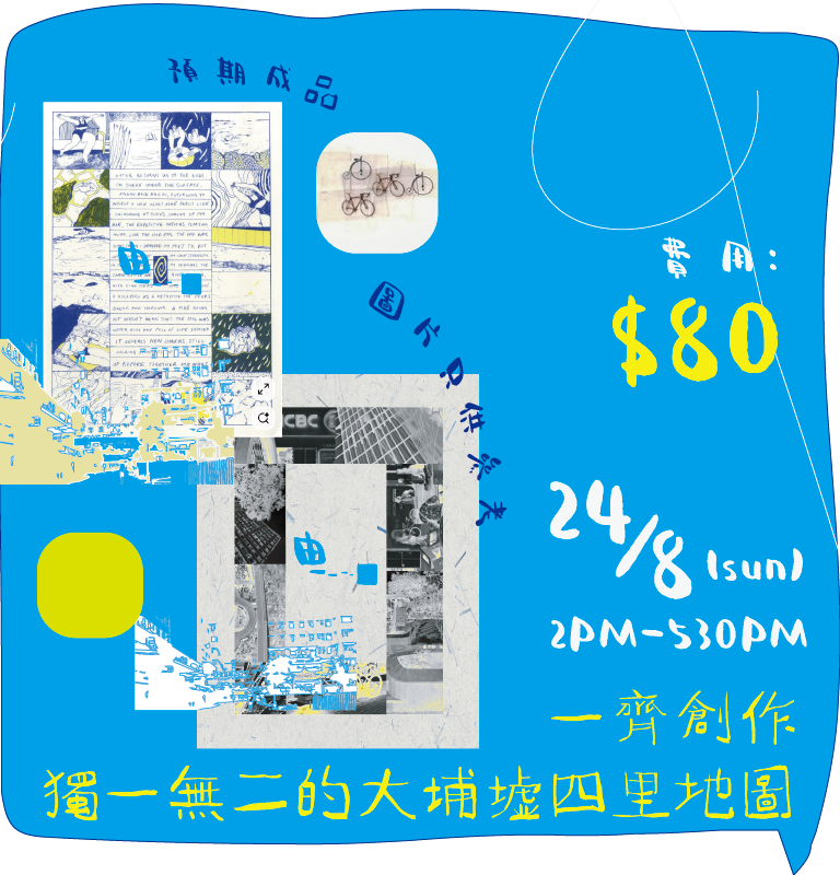 參加者將以Miki特製的工具包紀錄四里中令他們動容或有趣的一幕,互相分享自己的作品,聆聽各位的所見所聞,最後再組合成一張獨一無二的大埔墟四里地圖,在時代萬變中留住當下。