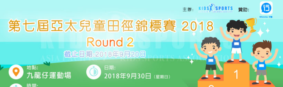 本會於 2018 年 9 月 30 日(星期日)假九龍仔運動場舉辦第七屆亞太兒童田徑錦標賽 2018(Round 2), 為增進各地區兒童田徑運動交流, 及早發掘其潛能,培訓明日之星, 特別是大中華地區, 是次比賽將設多項親子比賽, 更鼓勵家長積極參與, 促進家庭樂.