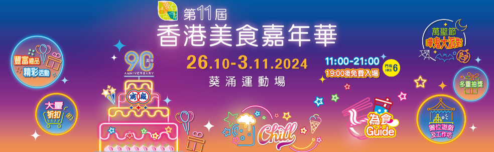 萬眾期待的「第11屆香港美食嘉年華」將於10月26日至11月3日一連9天在葵涌運動場舉辦,設超過300個攤位,展銷食品飲料、美酒美食、蔘茸海味、糧油雜貨、保健食品及家電廚具等優質及至抵產品。