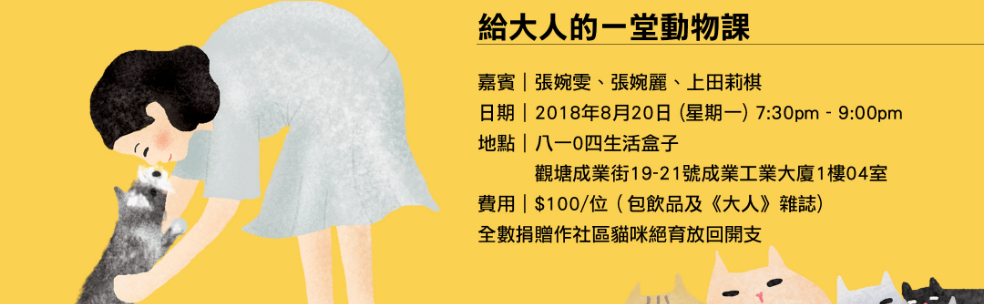 關於香港的動物權益時有爭議,這一課由《大人》記者黃曉婷主持,香港作家兼動保人士張婉雯、旅遊記者兼非洲野生動物保育義工上田莉琪、前線動物義工張婉麗主講,全部收入捐給社區流浪貓絕育。