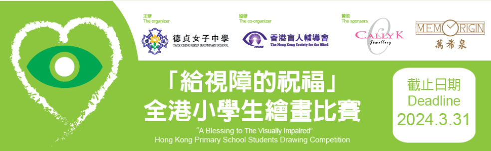 Fill in the registration form and paste it at the back of the work. Submit the work to Tack Ching Girls’ Secondary School (9 Hing Wah Street West, Sham Shui Po, Kowloon) by post or in person on or before the submission deadline. Please states “A Blessing to The Visually Impaired -- Hong Kong Primary School Students Drawing Competition” on the envelope if delivered by post.