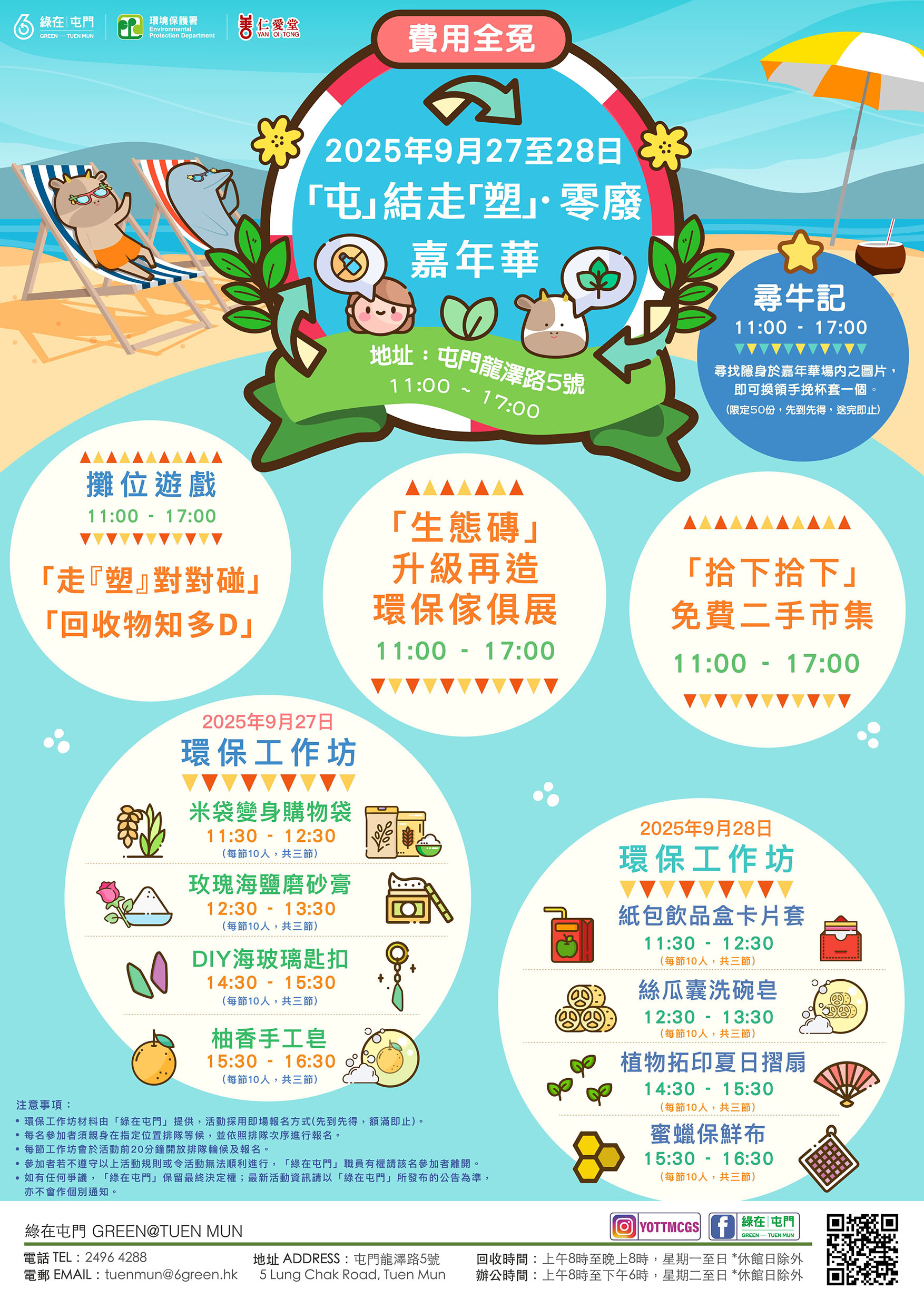 - 3. 環保工作坊材料由「綠在屯門」提供,活動採用即場報名方式(先到先得,額滿即止);每名參加者須親身在指定位置排隊等候,並依照排隊次序進行報名。