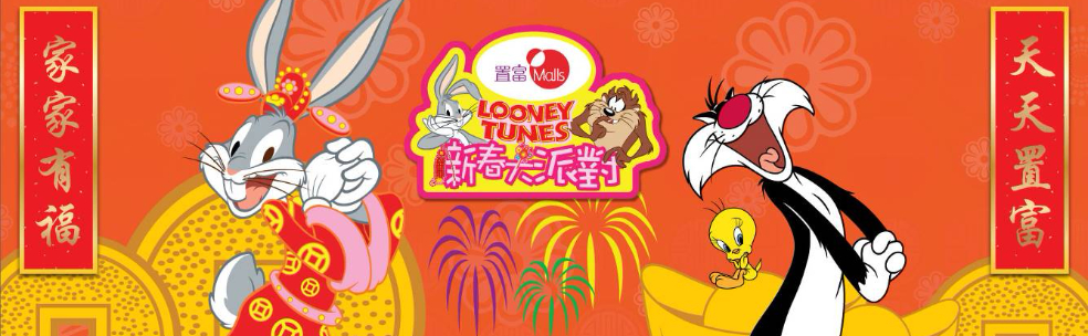 置富Malls今個新年請來人見人愛的LOONEY TUNES齊集置富Malls各大商場(包括置富嘉湖、置富第一城、置富都會、馬鞍山廣場、都會駅、麗港城商場、麗城薈、映灣薈、銀禧薈、荃薈) 與你歡度佳節,超過10個大受歡迎的LOONEY TUNES卡通人物包括Bugs Bunny (兔巴哥)、Tweety (崔弟)、Porky Pig (豬小弟)及Sylvester (傻大貓)等與你大開新春派對,祝願各位在新的一年「天天置富‧家家有福」。