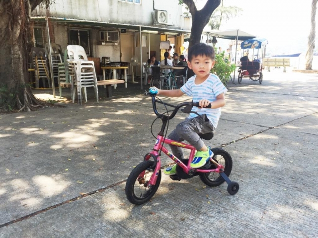 今次長洲之旅也主要想讓楊小寶嘗試踏單車。在島上很多遊人會租單車作環島遊, 但基於楊小寶只剛剛3歲, 這是他第一次踏單車, 所以我們不作環島遊, 而選擇在空地讓他踏踏。如果像我們帶著小孩又不作環島遊的話, 可以來到碼頭附近天后宮這邊租單車, 天后宮前面有一大片空地, 而且兩旁也有雨蔭擋太陽。