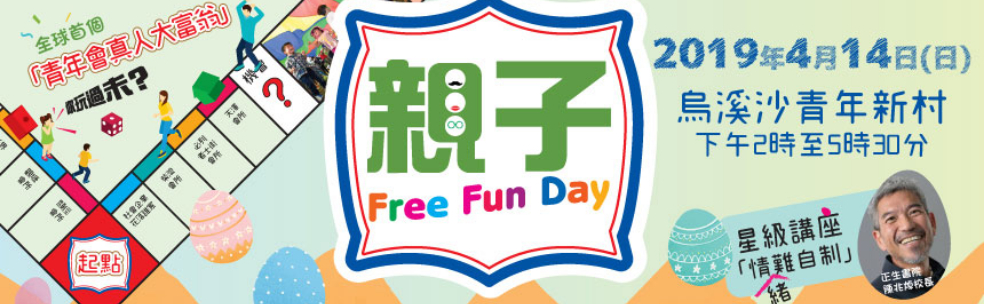 深受家庭歡迎嘅「親子Free Fun Day」又嚟喇!4月14日(星期日)青年會將會喺烏溪沙青年新村會提供一系列新奇、好玩、益智、刺激嘅活動俾大家參與,歡迎一家大細嚟玩到盡興!精彩活動包括:
