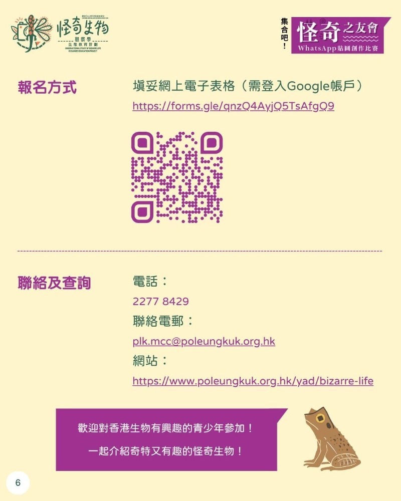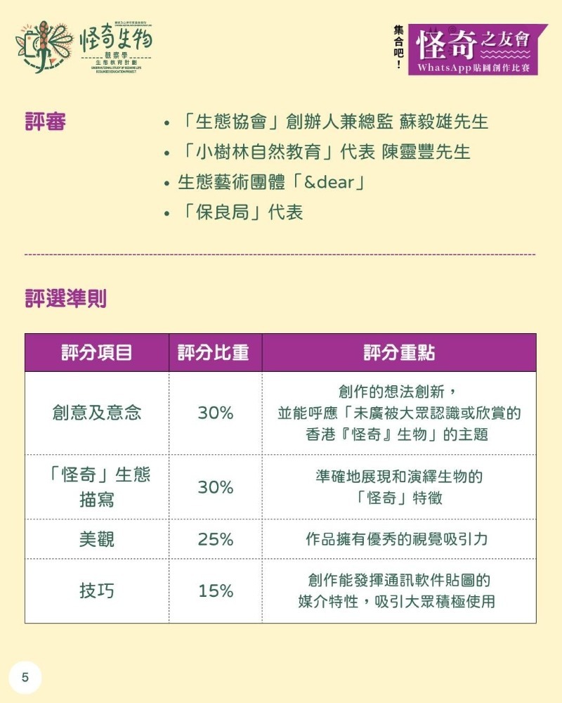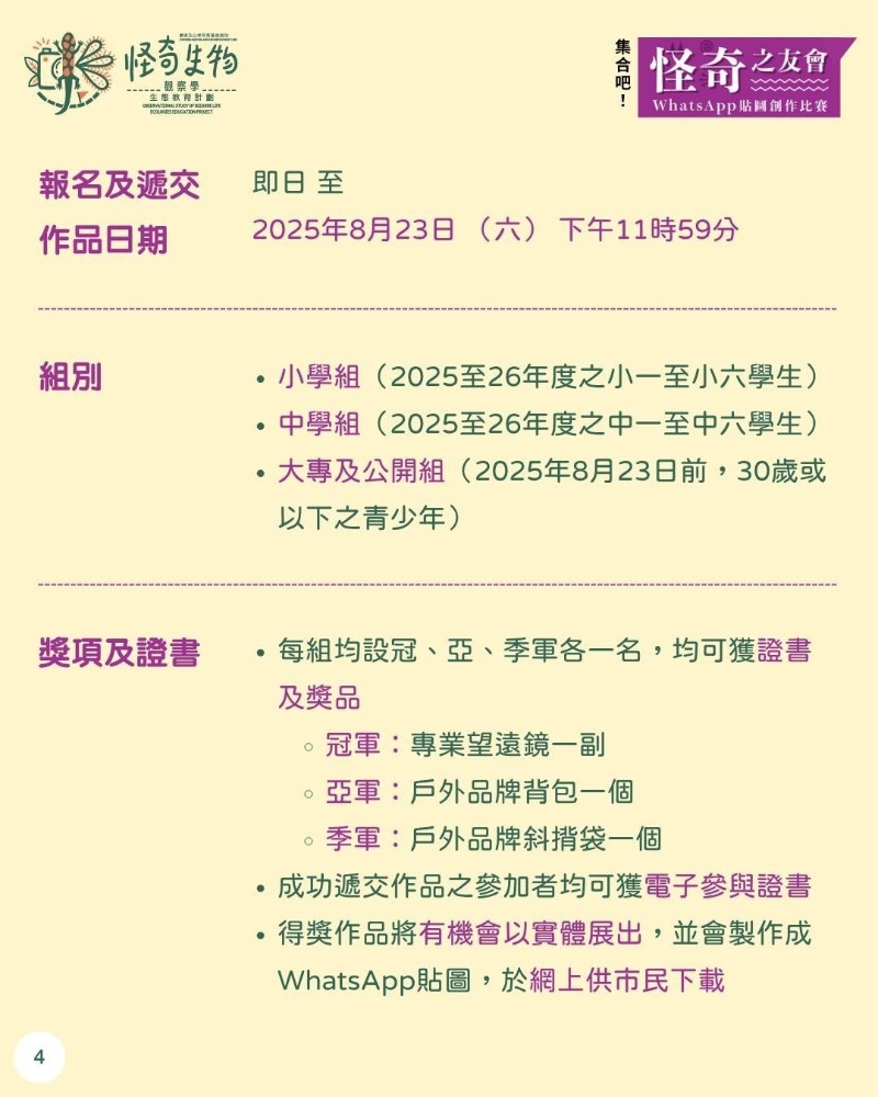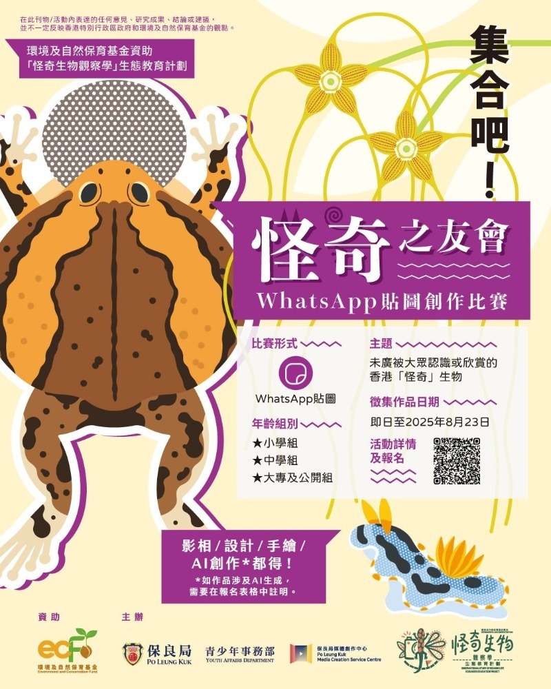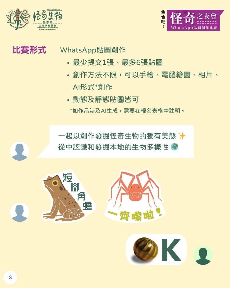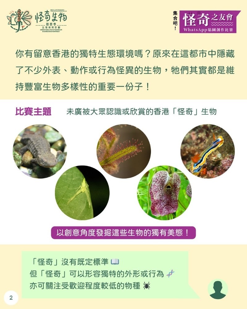 「集合吧!怪奇之友會」WhatsApp 貼圖創作比賽 鼓勵青少年以被人忽略、誤解或恐懼嘅香港特色動物🦎、植物🌱、昆蟲🕷️等為主題,創作兼具生物特色同趣味嘅創意WhatsApp貼圖,等大家喺日常生活💬中都可以分享同推廣同樣值得畀人欣賞嘅「怪奇」生物。