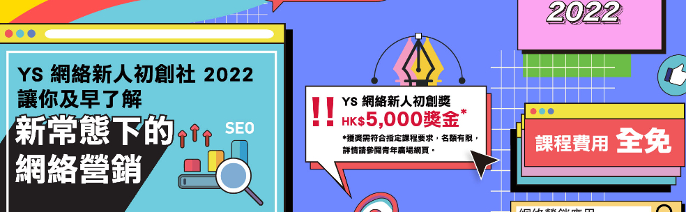 「YS 網絡新人初創社2022」由即日起開始接受網上報名,課程費用全免。整個課程共有十六堂課,內容除包括社交媒體管理、內容營銷、影片製作、修圖技巧、搜尋引擎行銷、社交媒體表現統計、電子郵件行銷及Google Analytics等熱門課程外,更邀得業內人士進行分享。完成課程後,達到指定出席率的學員除可獲得由青年廣場簽發的證書外,表現最優異的五位學員更有機會獲得 HK$5,000獎金以及與我們的策略夥伴合作,真正投身社交媒體管理行業。