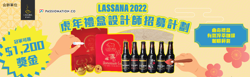 為支持本地設計師,Passionation 聯同香港本地咖啡品牌LASSANA 舉辦「虎年禮盒設計師招募計劃」,不論年齡及設計經驗,只要能運用Adobe Illustrator 或Adobe Photoshop 設計新系列合資格參賽。LASSANA 會採用冠軍的設計並生產一系列的虎年產品,包括曲奇禮盒、有氣冷萃咖啡及咖啡杯套,將於LASSANA 門市及網店上架。冠軍更可獲$1,200 獎金及價值約$800禮品;最後5強亦可各得有氣冷萃咖啡1套6枝。