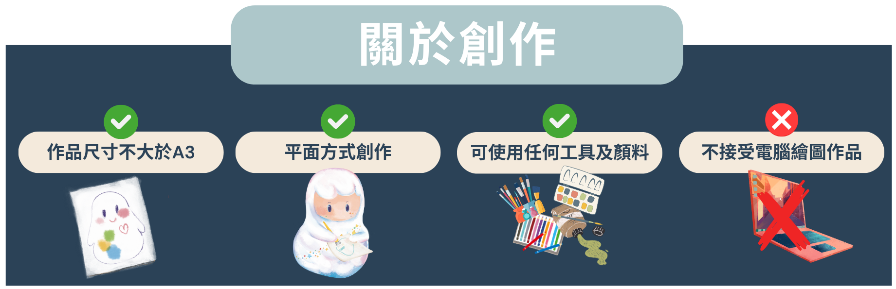 歡迎使用任何繪畫工具、顏料創作,但作品必須為平面創作,不可以用剪貼或電腦繪圖創作作品。