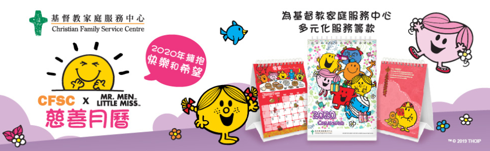 本會非常榮幸與英國經典卡通角色Mr. Men Little Miss(《奇先生妙小姐》)攜手推出「慈善月曆2020」。座枱月曆設計別出心裁,內附精美備忘,卡通角色的可愛幽默性格,融入每月不同的主題中,展現出「愛家、夢想、護老、關愛、希望、豐盛、健康、共融、宜居、公義、進步及卓越」各項本會著力推動的社會核心價值。