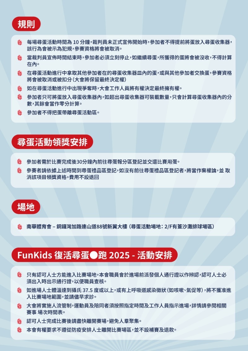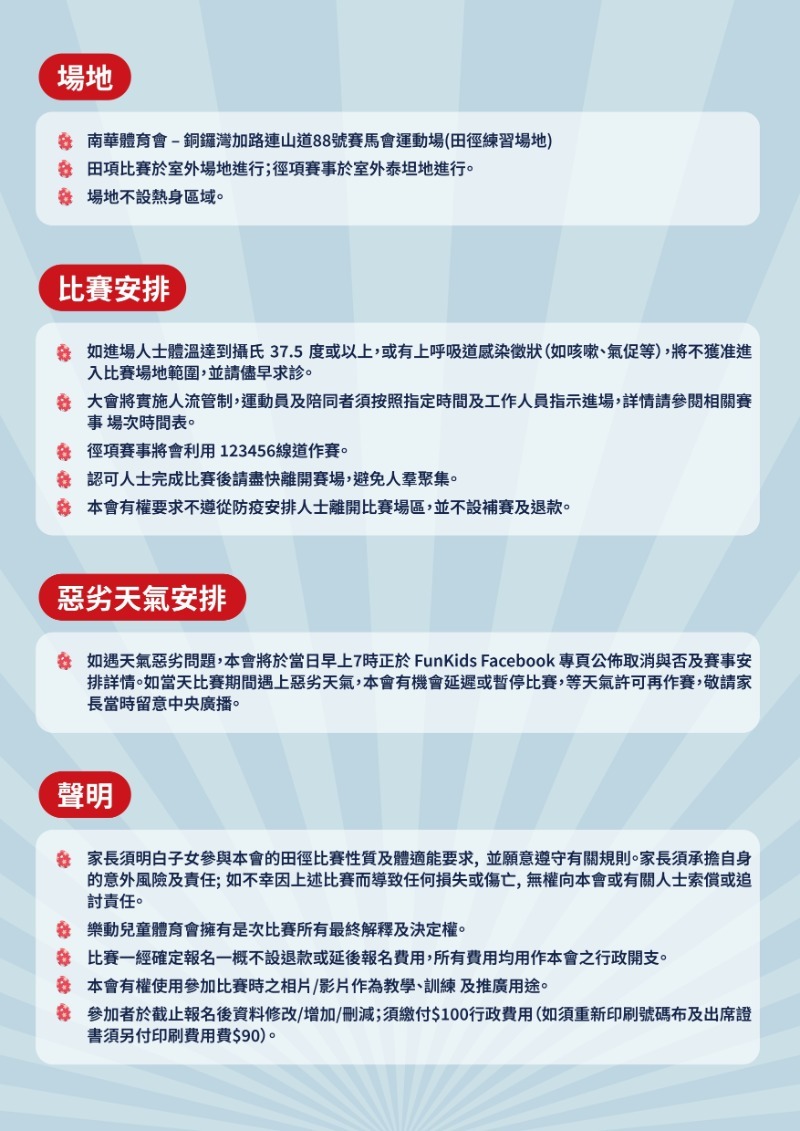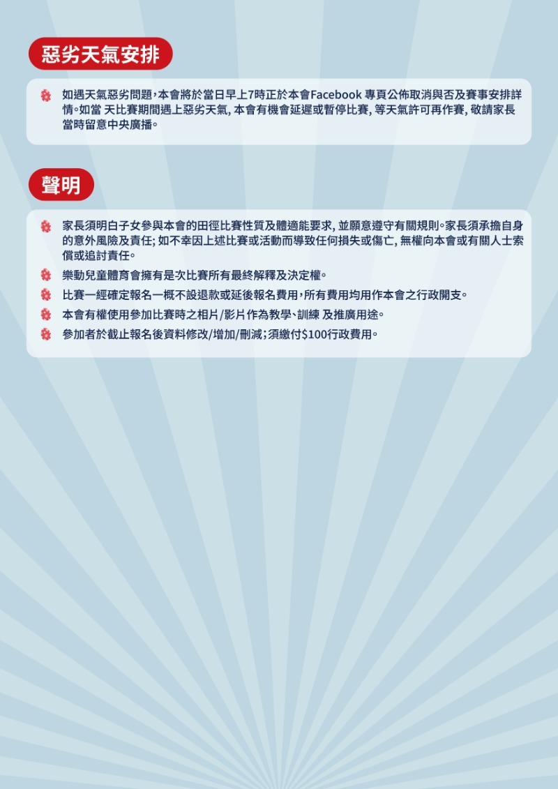 費用:$190/項 (參加3項或以上賽事可享折扣優惠,優惠只適用於報名田徑比賽,尋蛋活動不適用)