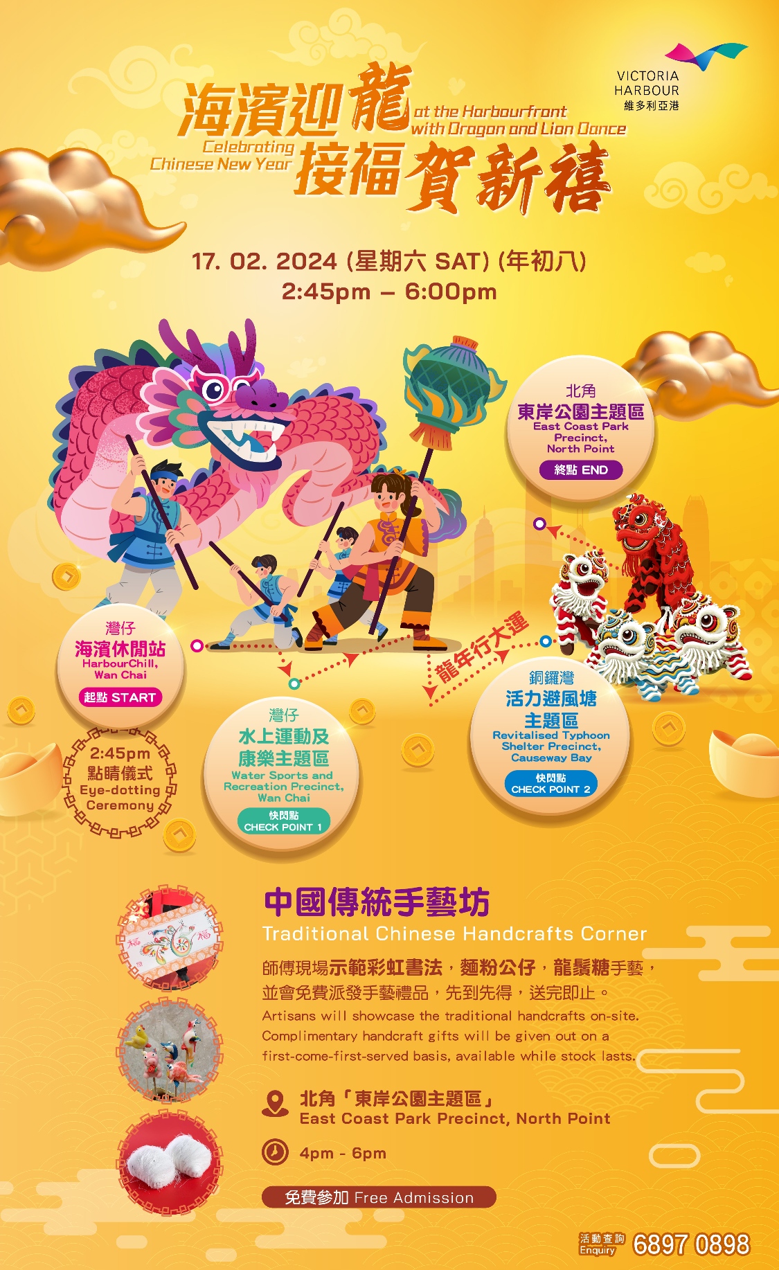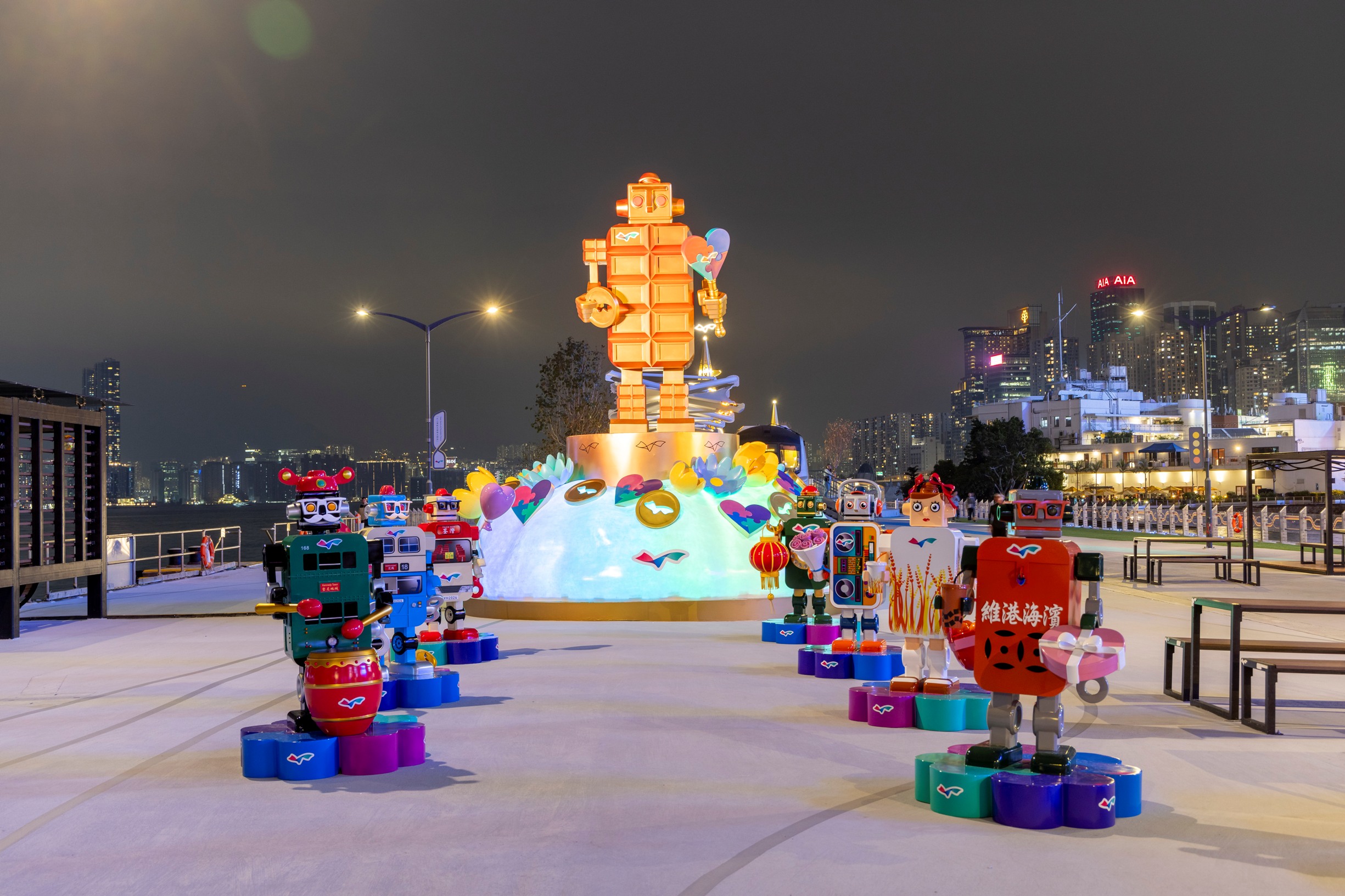 發展局和海濱事務委員會特意呈獻《海濱新維度 • 拼湊生活彩圖》甲辰龍年新春期間限定裝置及活動,結合光影、編織藝術、懷舊和有趣互動元素,設置多個大型立體裝置,打造段段有特色的新春海濱共享空間,地點包括:灣仔「HarbourChill海濱休閒站」的9米高充氣雙面「至Chill地標!」、灣仔「水上運動及康樂主題區」的「八星報喜旺新禧」鐵寶機械人裝置、銅鑼灣「活力避風塘主題區」6米高的「昇福昇運樹」,以及北角「東岸公園主題區」逾120米長的「游龍維港」編織藝術裝置,誠邀大家和親朋至愛在新春及情人節期間齊來維港海濱長廊行大運,玩勻四大賀年裝置打卡位,祝願新一年滿滿好意頭!