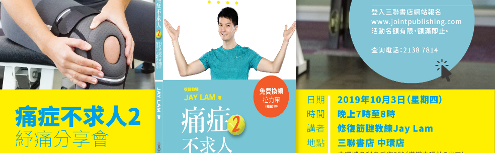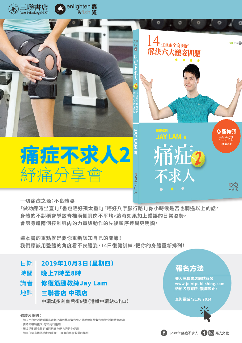 一切痛症之源 : 不良體姿,「做功課時坐直!」,「書包唔好孭太重!」,「唔好八字腳行路!」你小時候是否也聽過以上的話?身體的不對稱會導致脊椎兩側肌肉不平均,這時如果加上錯誤的日常姿勢,會讓身體兩側控制肌肉的力量與動作的先後順序差異更明顯。是次分享會修復筋腱教練Jay Lam將會教大家重新認識自己的關節,透過書中介紹的14日復健訓練,一起痛症不求人!
