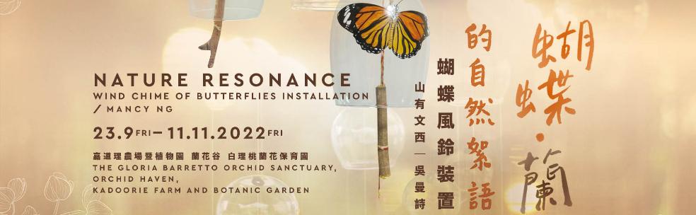 蝴蝶風鈴裝置以「蟲媒花」及「蝴蝶風鈴」為主題,糅合視覺、聽覺、嗅覺的感官元素,配合嘉道理園蘭花谷的自然環境,實驗環境與聲、畫的自然結合。現場掛上超過60個繪畫了香港不同蝴蝶品種的風鈴,展示出蝴蝶的獨特模樣和姿態,配以重用織繩、園內木枝及種子等自然及環保素材製成「蝴蝶風鈴」。
