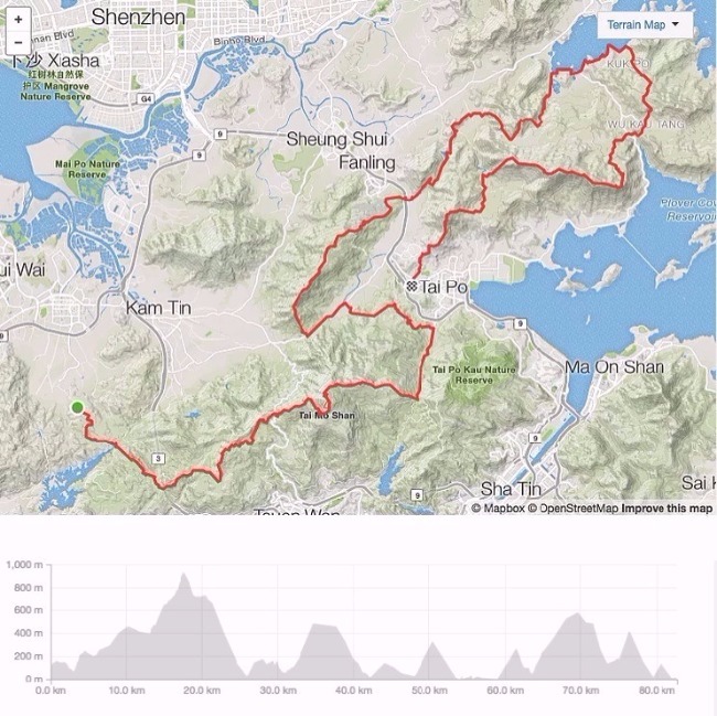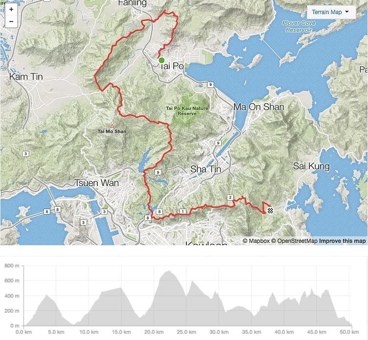 50公里的比賽路線從北至南,包括新界至九龍的山徑, 部份衛奕信徑和麥理浩徑. 高度攀累計3,123米.