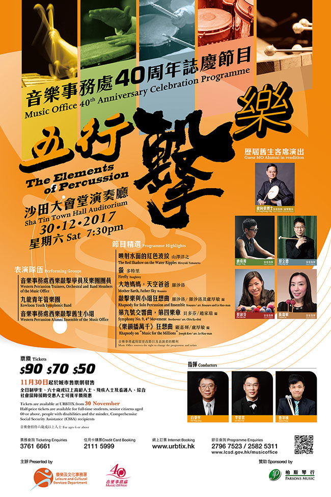 為慶祝音樂事務處成立40周年,音樂事務處西樂敲擊學員、樂團團員和敲擊樂舊生透過音色變化多端的敲擊樂,為大家送上一場以《五行》元素 – 金、木、水、火、土為主題的音樂會。