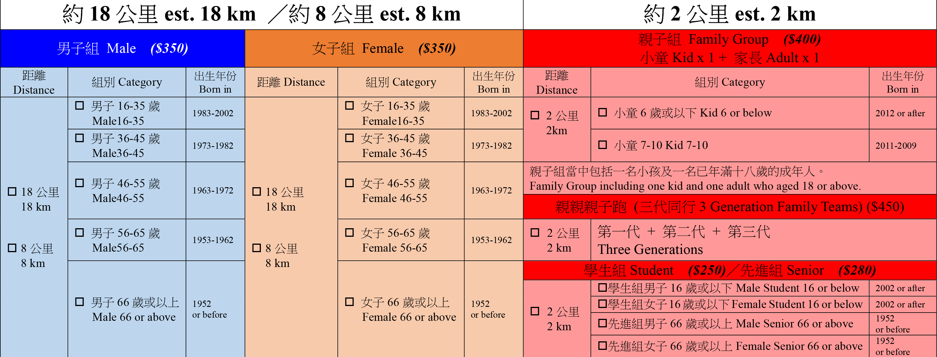 18公里(男/女):16-35歲 , 36-45歲 , 46-55歲 , 56-65歲 , 66歲或以上