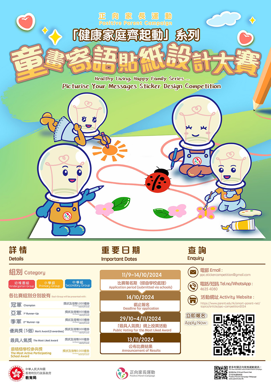 為提高學生、家長及公眾人士對「正向家長運動」的認識,以及配合推廣教育局於2024/25學年推出的《4Rs精神健康約章》,教育局現舉辦「健康家庭齊起動」系列活動,旨在鼓勵家長與子女一起建立健康的生活習慣,包括充足睡眠、每日運動、參與閒暇活動等,讓自己和子女都可以適度放鬆,保持身心健康,促進子女愉快和健康成長。學生和家長可透過參加「童畫寄語貼紙設計大賽」發揮創意,以繪畫形式創作一套四款不同主題的貼紙,表達父母與子女如何同心合力建立良好的生活習慣。