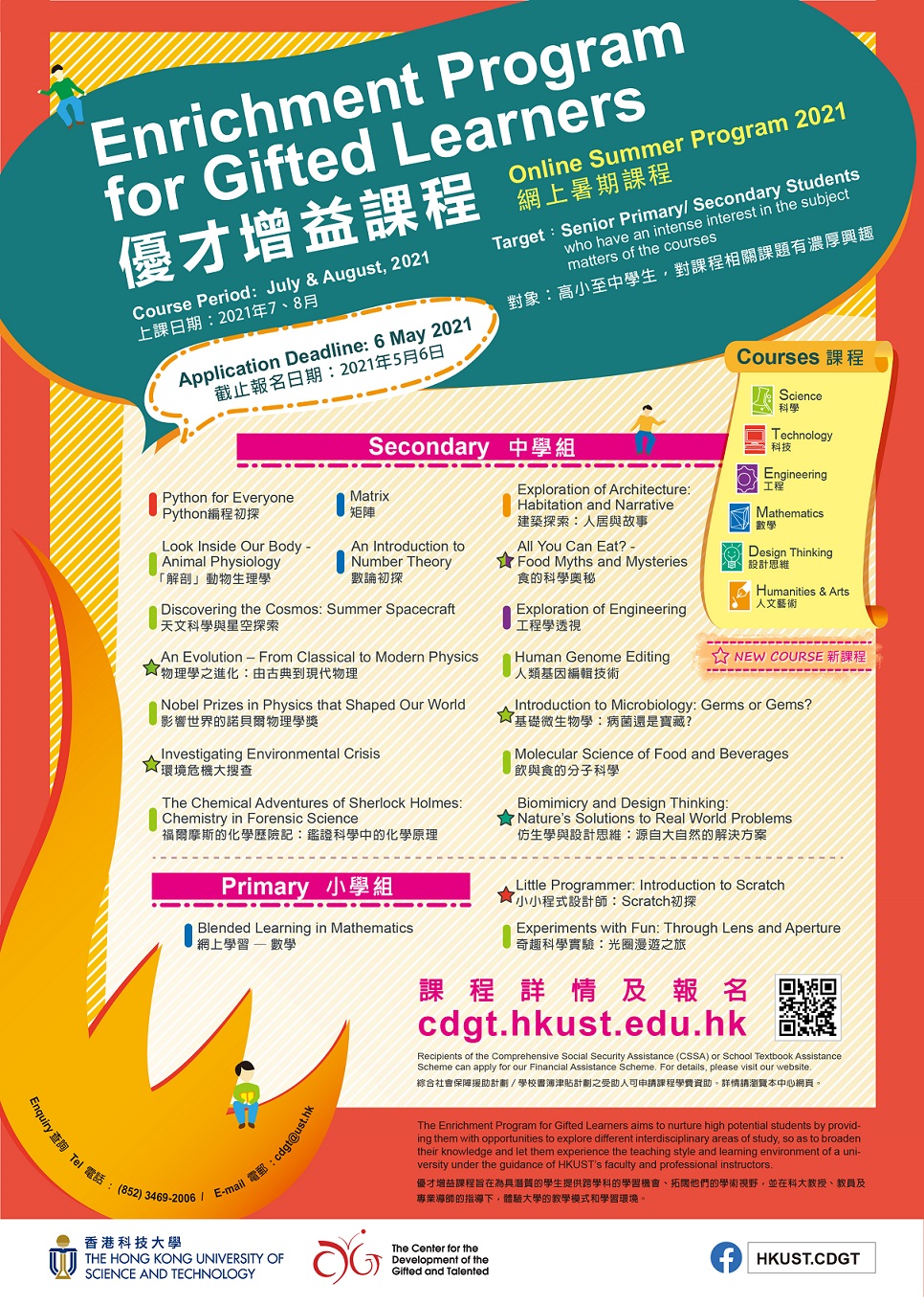 香港科技大學資優教育發展中心舉辦的「優才增益課程(網上暑期課程2021)」將於七、八月期間開課,現正接受網上報名。