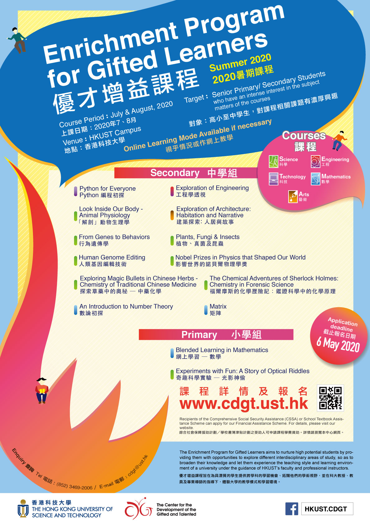 由香港科技大學資優教育發展中心舉辦的「優才增益課程(2020暑期課程)」將於七、八月期間開課,現正開始接受報名。