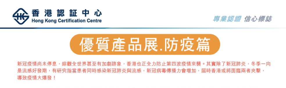 11月3-7日於九龍灣國際展貿中心舉辦之優質產品.防疫展已完結,由於反應熱烈及成績理想,故此,香港認証中心 (HKCC) 於11月17-23日加推優質產品展.防疫篇,將已通過國際標準測試之本地生產或進口優質的防疫產品帶給大眾,包括口罩,健康補充品等,應有盡有。