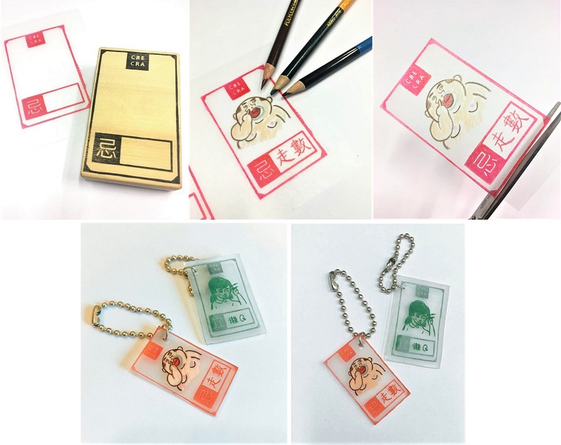 CRE瀝卡啦為大家準備了童年美勞堂必玩的熱縮膠片鎖匙扣工作坊,帶大家回到過去,重拾兒時小學雞回憶。熱縮膠片圖案大玩傳統日曆元素,讓大家發揮創意。先把印章蓋上熱縮膠片,再自行填上「宜」、「忌」事宜。簡單易做的小手工,搖身一變成別樹一格的紀念品。