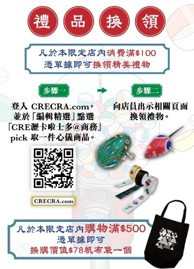 於「CRE瀝卡啦士多」消費「撐手作」,滿指定金額即送你CRECRA好禮!禮品除了各式懷舊玩具外,更有CRECRA設計的香港主題文具,包括便利貼和紙膠帶等。